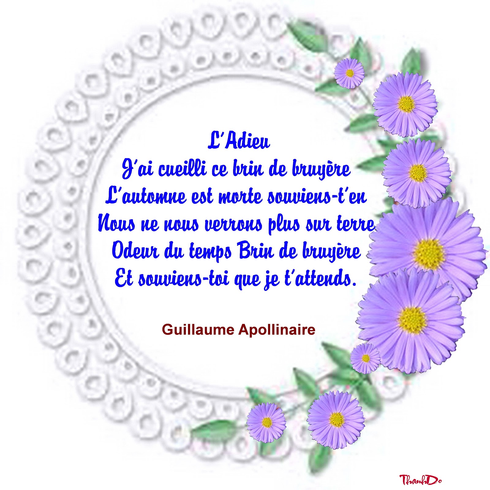 Độc giả, đặc biệt là những người từng ở miền Nam trước năm 1975 ai cũng biết rằng bài Mùa thu chết rất nổi tiếng của nhạc sĩ Phạm Duy là phổ thơ Apollinaire, một nhà thơ Pháp sinh năm 1880 và chết năm 1918. Bài thơ của Apollinaire vỏn vẹn chỉ có 5 câu, mang tựa đề L'Adieu (Giã biệt), chúng tôi xin ghi lại nguyên văn:
